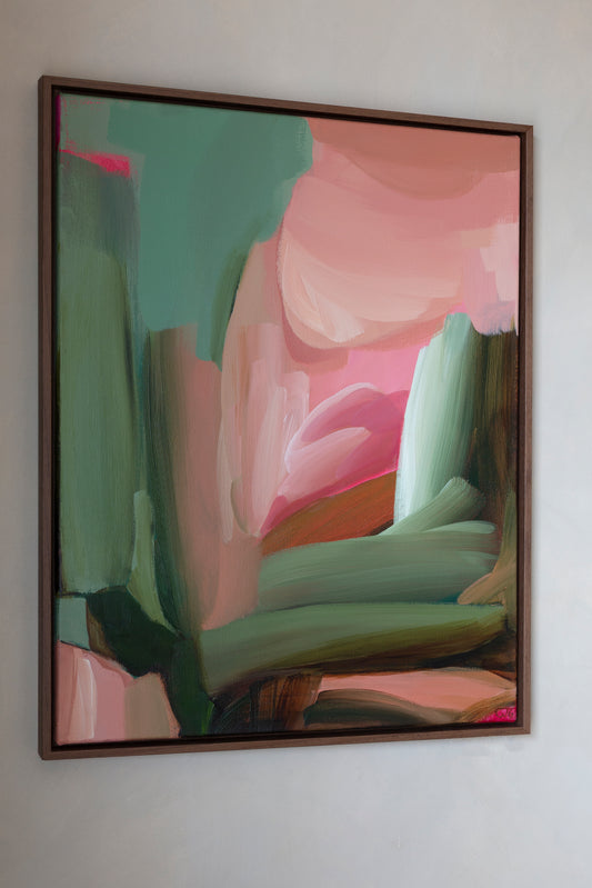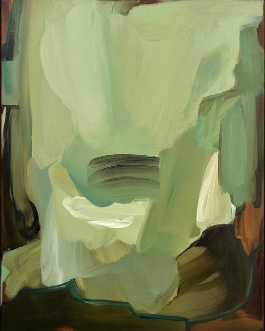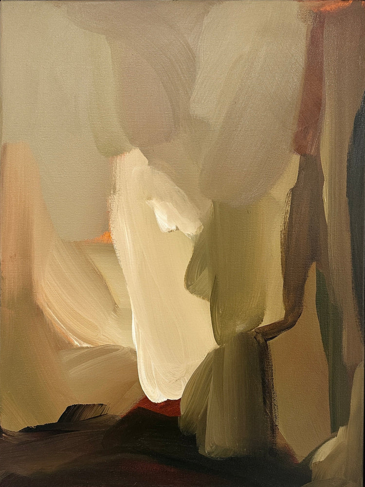 There is, at times, a relationship to the landscape whilst not being site specific. Her palette features richly deep hues, the language of nature, with many pieces expressing a purely abstract aesthetic. There is a balance between expressionism and informed thought.