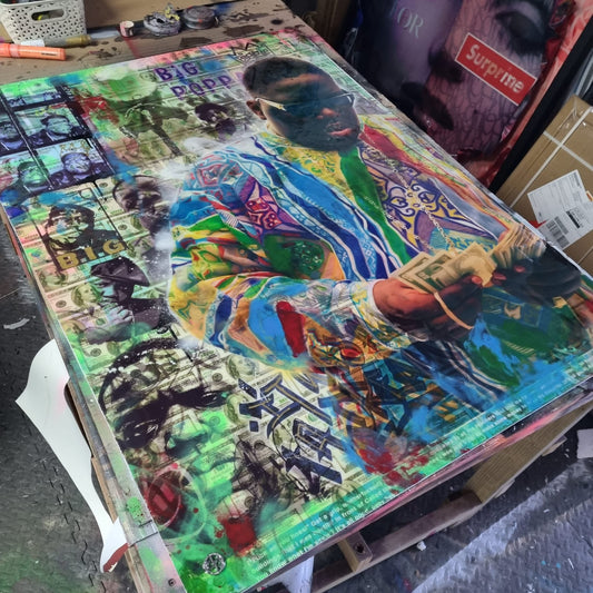 Having exhibited his work since 2013, Dan has rapidly become one of the UK’s most talked about and collectable artists. His unique artworks blend graffiti, collage, traditional painting and textured resin while incorporating unusual objects such as smashed glass and dollar bills to create his much sought-after pieces.