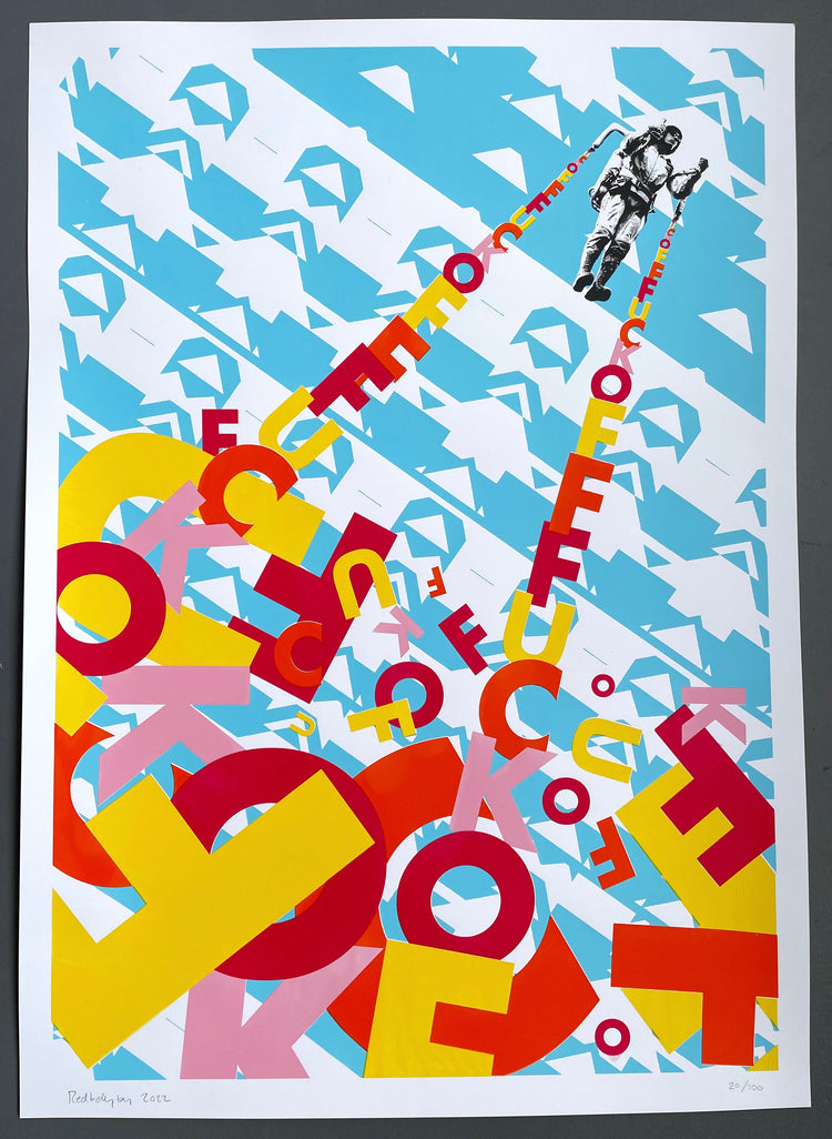 Ewan Taylor, AKA Redbellyboy is a filmmaker and artist. Originally from Aberdeen, Scotland, he studied at Edinburgh College of Art before moving to London, where he lives and works. He draws inspiration from pop culture, film, graphic design, loud music and tries to squeeze as much of it into his work as possible. Bright colours, bold lettering, intricate designs, and humour are all key ingredients in his work. Redbellyboy has created work for Print Club London’s collaboration with the iconic Katharine Hamnett 'Choose Love' charity campaign and was elected by Grayson Perry to be part of the Royal Academy Summer Exhibition 2022.