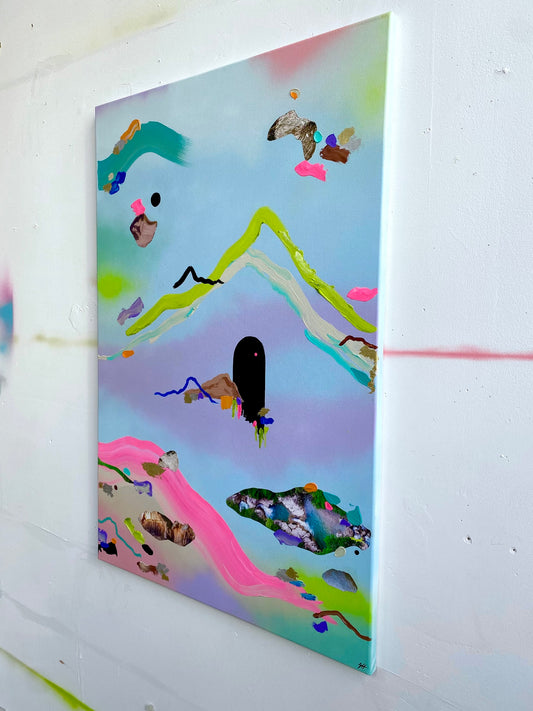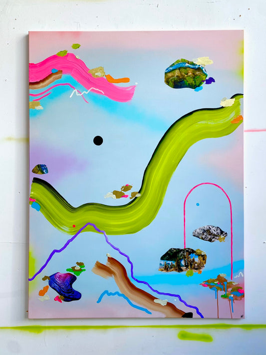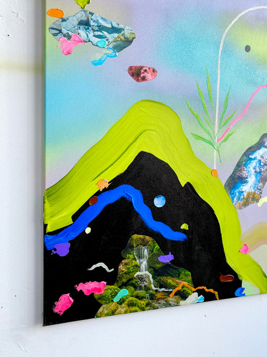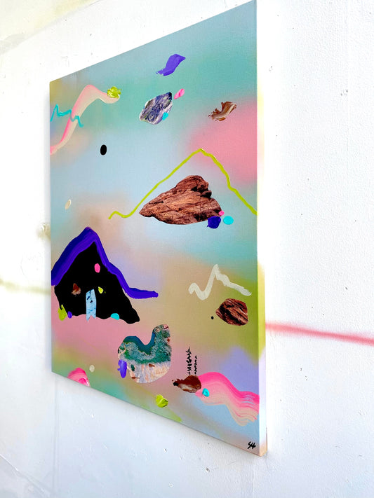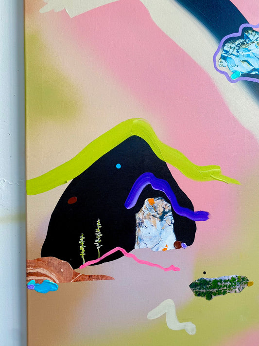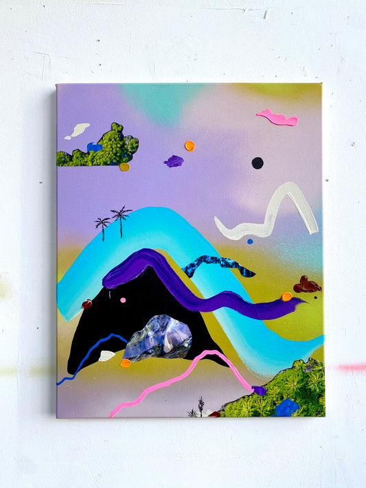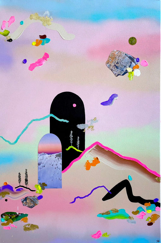 Sara Hoque is a mixed media artist currently working in London. She is recognised for her abstract landscapes which explore the majesty of the natural world. Born to a Norwegian mother and British/Bengali father, a multicultural upbringing led her to frequent travel. Her magical childhood encounters in nature have since formed the foundation of her work. By using acrylic paint and collaged images, Sara’s work explores the wonder we experience in nature. Through her work she aims to untangle the complexity that is described as ‘awe’, an emotion that can be pleasurable or imbued with mystery and uncertainty. She is known for her bold use of colour which is an integral part of capturing these emotions.