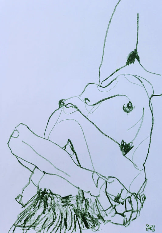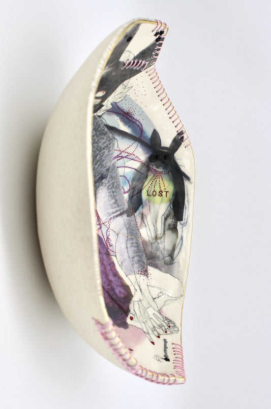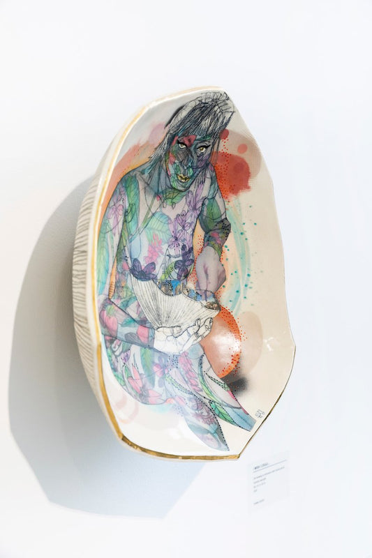 Starting with life drawing and experimenting with other media, she found herself drawn to her cultural roots in ceramics, mixing the two. In 2013 she made bowls and sketched live models drawing directly onto the contoured surfaces, combining the organic hand-moulded form of the bowl with the human form of the model. A couple of years later she began to add imagery to the pieces to extend the narratives that began with the poses, seeking inspiration from what she found captured in the drawings.