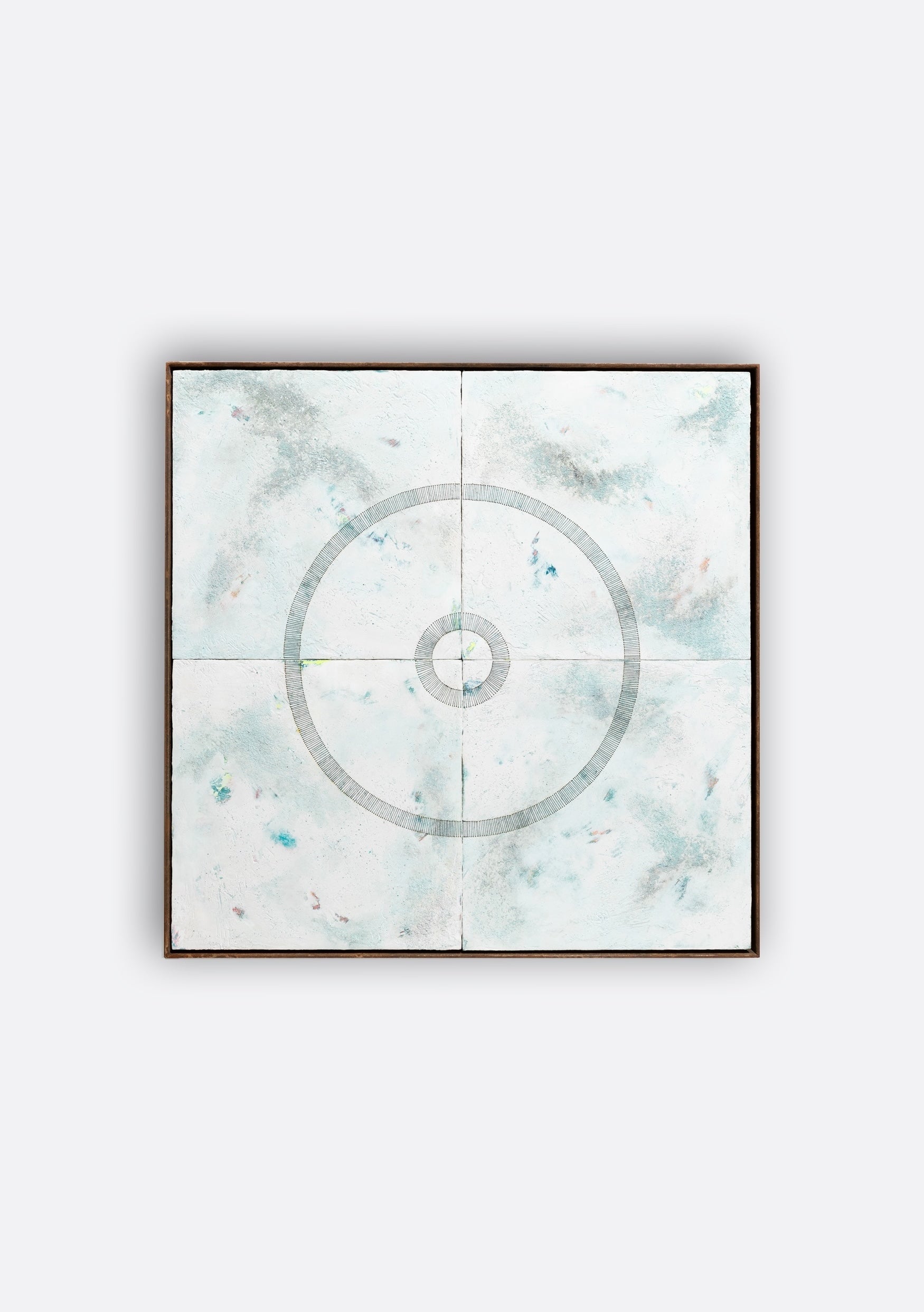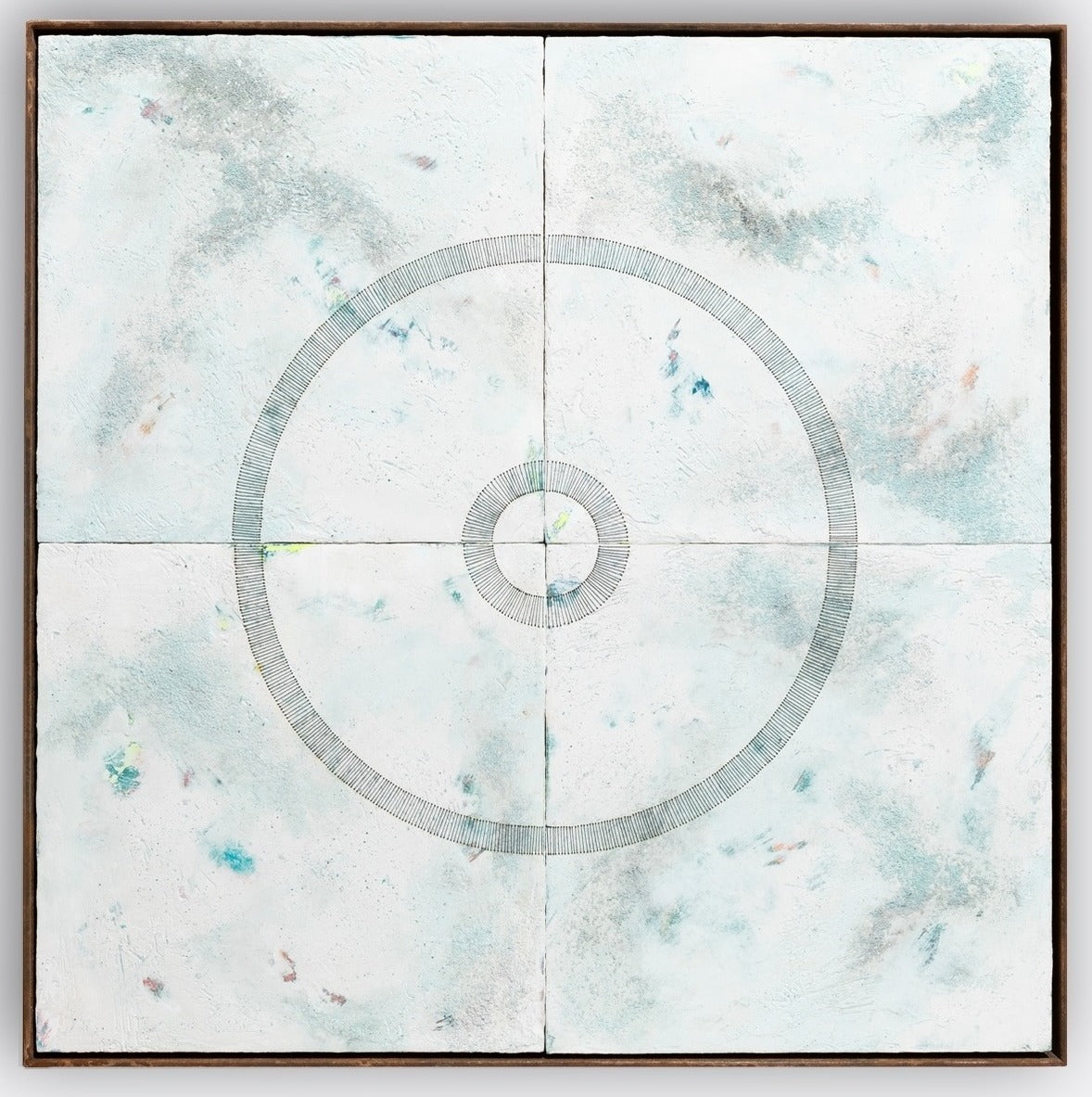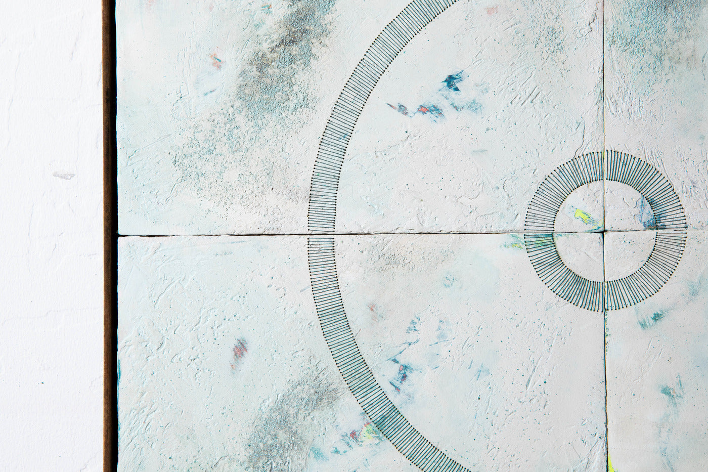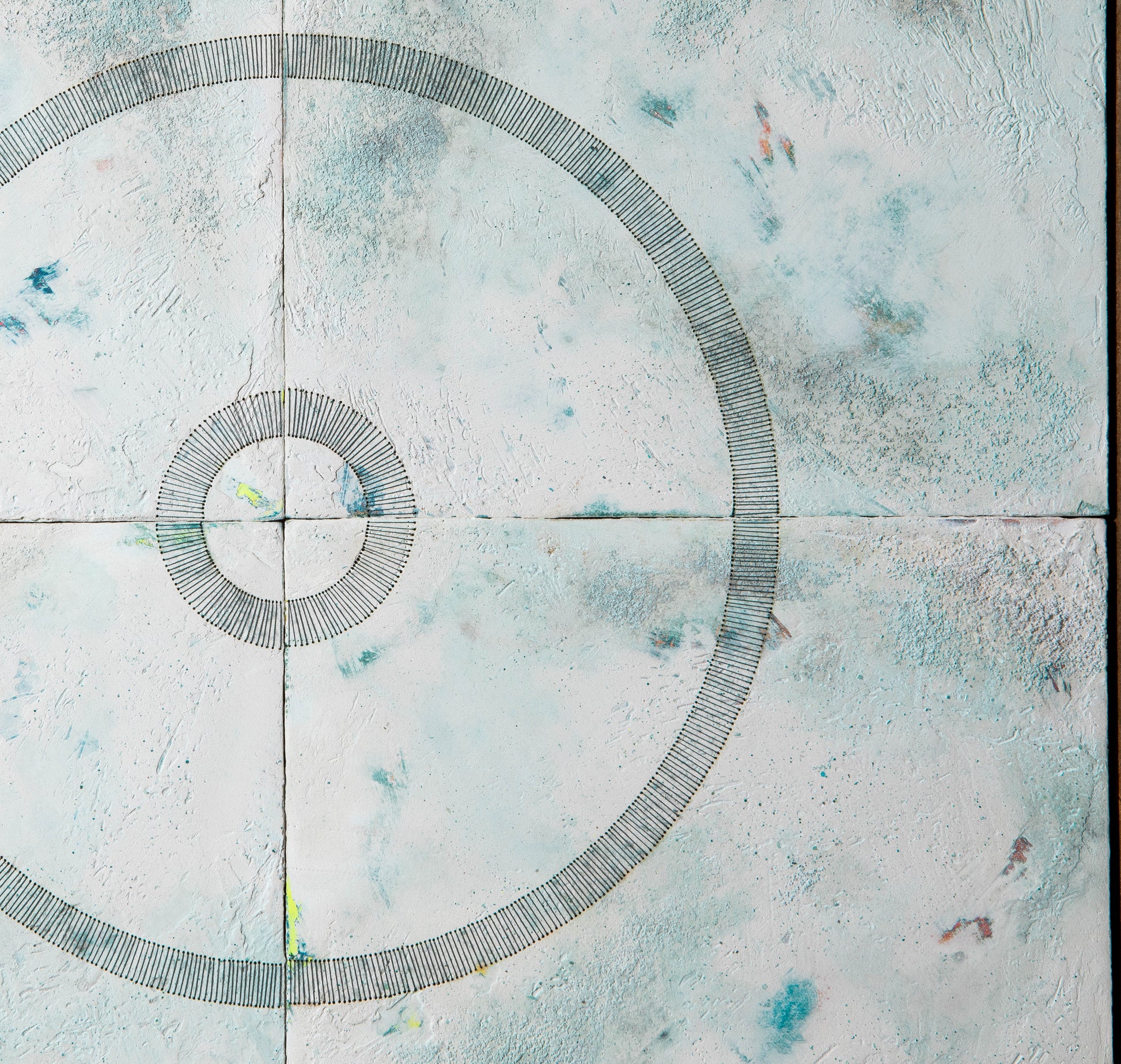 Plaster, acrylic, pumice gel, copper powder and embroidered thread on birch plywood in Corten Steel Frame